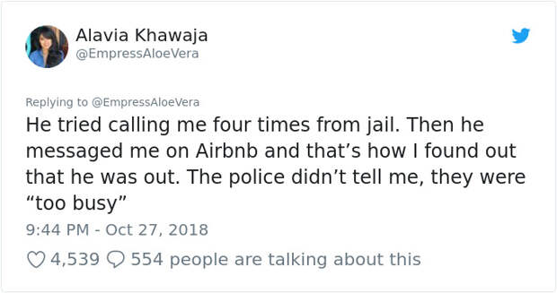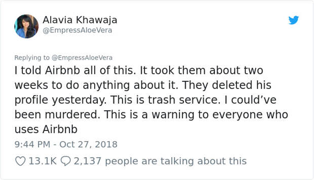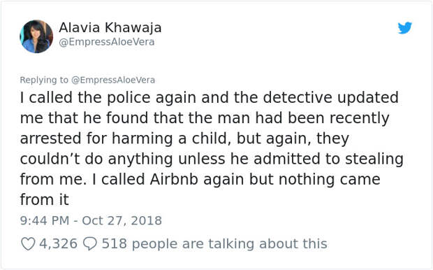 Alavia says she is definitely done with renting her home out, especially since after her terrible encounter two other women had to deal with the same man and neither Airbnb nor police took any actions to help them. Not only that, but many people put blame on the victim by saying it was Alavia’s fault for getting herself into a situation like that, ” Those who say it is my fault have their focus on the wrong subject. Teach people to treat others with respect, as opposed to stressing how to keep disrespectful people at bay.”