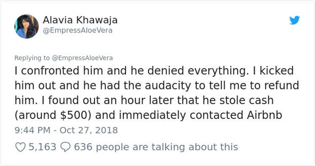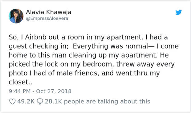 Recently a young woman named Alavia Khawaja took to Twitter to share how dangerous renting your room on Airbnb can be
