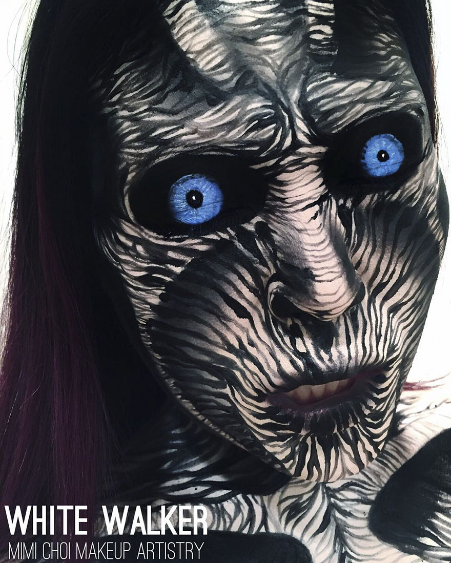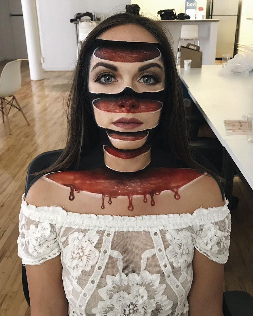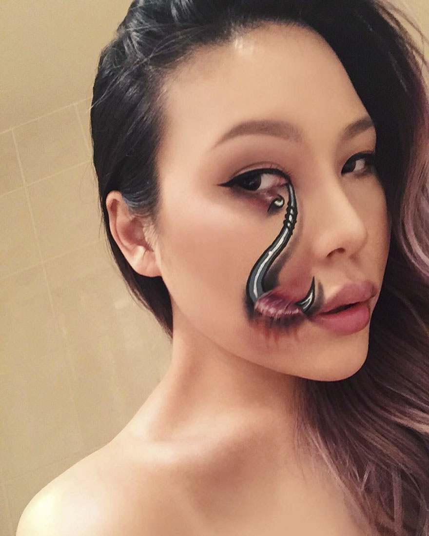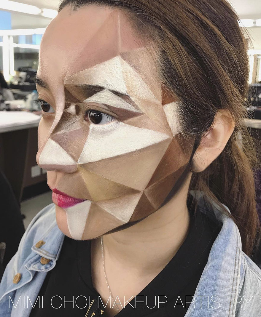 Choi creates her mind-blowing work through masterfully understanding perspective, creating three dimensionality on a flat surface. She manipulates makeup like an artist uses his paint and places shadows onto her body to make her skin either pop out or recede back into the body.