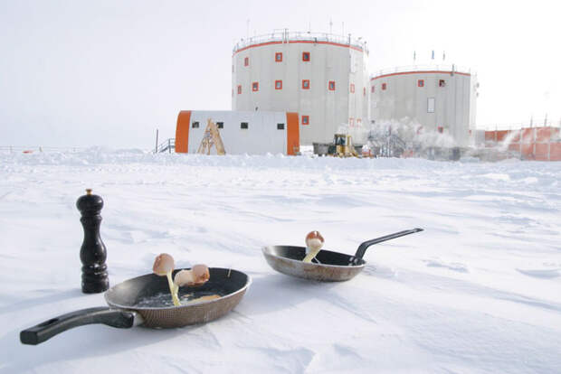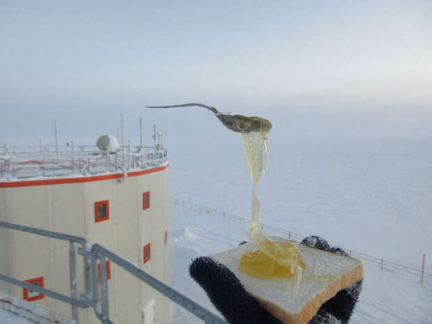 Just for fun, Cyprien decided to go outside and have a go at ‘cooking,’ taking photos of different kinds of foods in the deep freeze. Of course, it was just a game, but the gravity-defying pictures vividly illustrate the absolute intensity of the cold down there in Antarctica, this is no picnic! “We run out of fresh food early in the winter (as we have no resupply from early February to early November), so we eat mostly frozen food: given that the temperatures never are in the positive, we just store it in containers outside.”