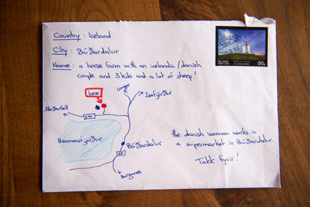 So, instead of putting an address on the envelope, he drew a map which leads to a farm in Hvammsveit, West Iceland, with a red dot marked on the destination. The envelope reads: ‘Country: Iceland.